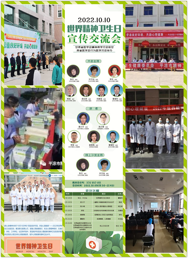 2022年10月10日,是第31个世界精神卫生日,今年宣传主题是“营造良好环境,共助心理健康”。为提高大众心理健康意识,普及心理健康知识,践行健康中国战略,在世界精神卫生日当天,甘肃省医学会精神病学分会、行为医学分会在主委的带领下,组织分会委员、会员,并联合委员所在单位在全省各市州开展了线上、线下不同形式的科普宣传和义诊活动。